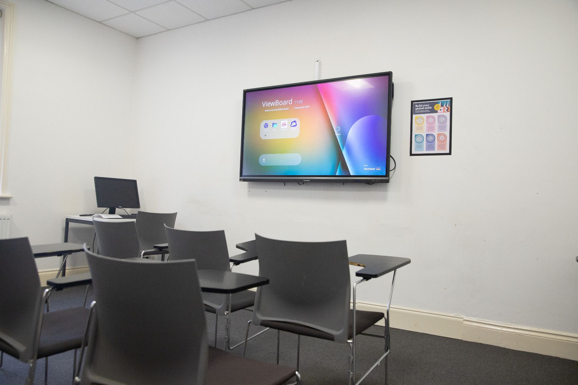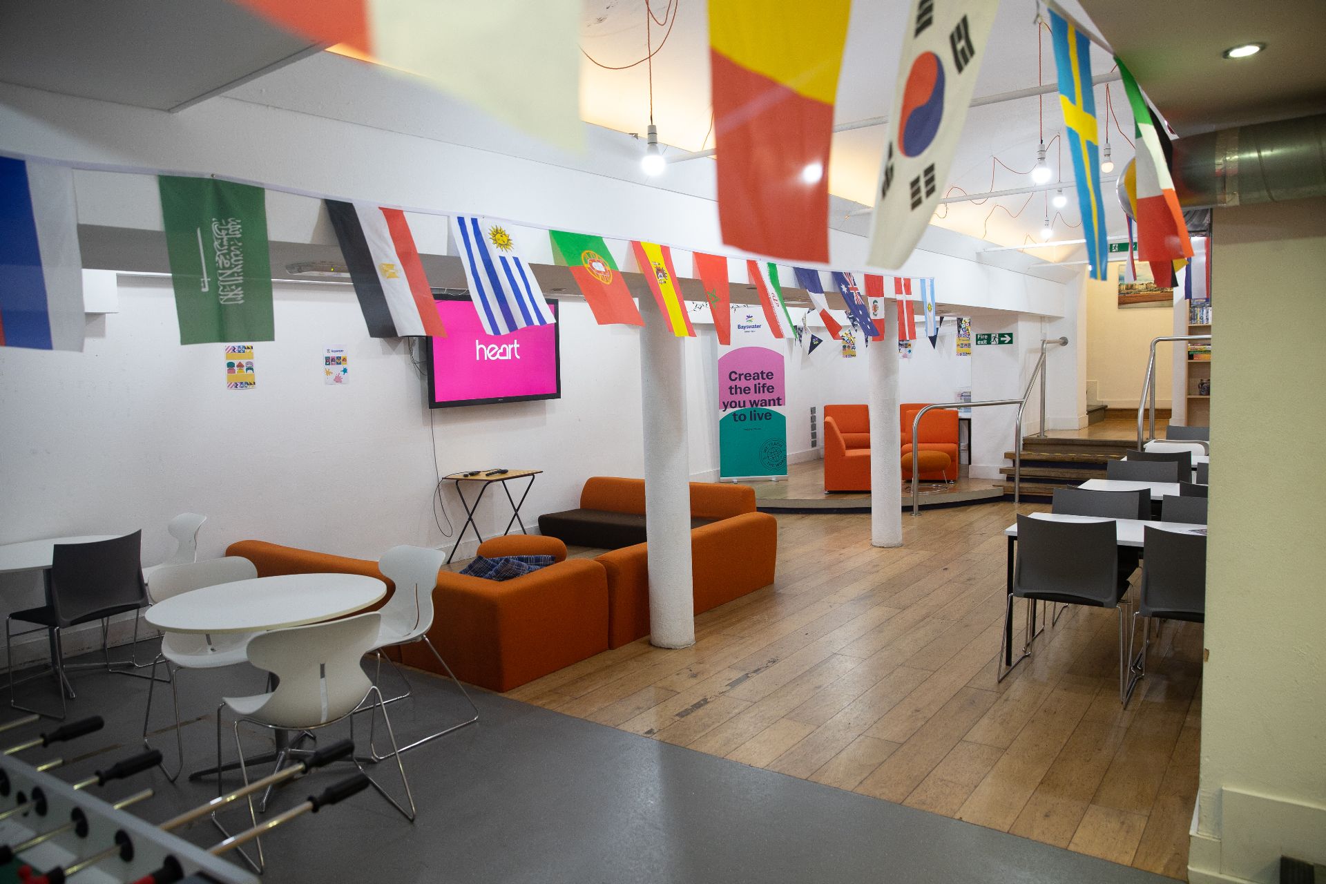 16のモダンな教室に加え、広々とした学生ラウンジにはフーズボール(テーブルサッカー)や卓球台があり、交流の場となっています。