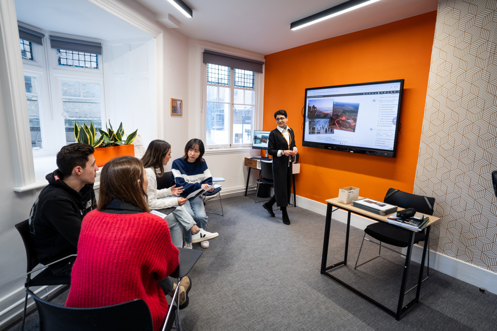 教室にはインタラクティブ・タッチスクリーンが完備され、自習室、学生ラウンジ、図書館など、学習をサポートする充実したモダンな設備が整っています。